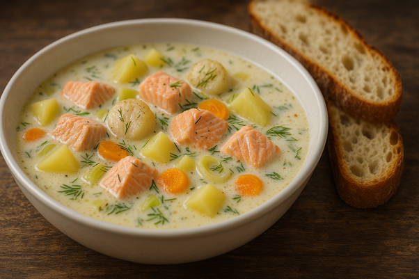 Финская сливочная уха с форелью и гребешком
